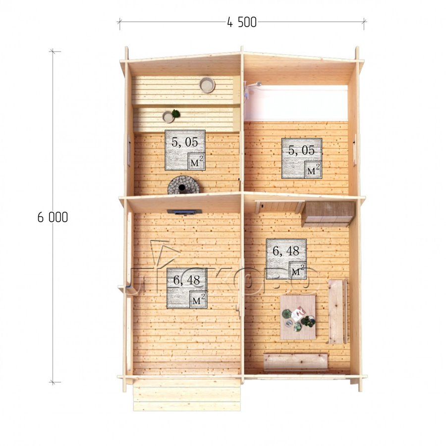- Стеновой комплект: мини-брус камерной сушки 45 мм с чашами под проект. Материал дерева — ель, сосна (ГОСТ 8486). Влажность 12-14%. Высота стен 2,16 м.;
